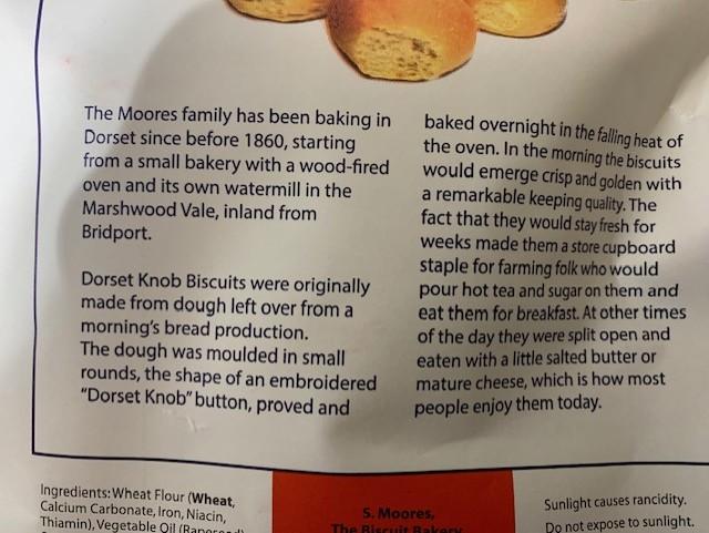 Hamper Alert. Dorset Knobs in good stock. These are baked thrice! Excellent Christmas hamper product. Weighs 225 grammes in the packet which measures 30 cms in height, 19 cms in width and 9 cms deep. There are approximately 20 knobs in each packet. These were originally made from dough left over from the mornings bread production. For your Christmas hamper or a stocking filler!