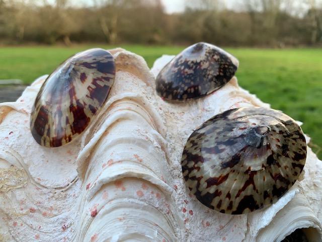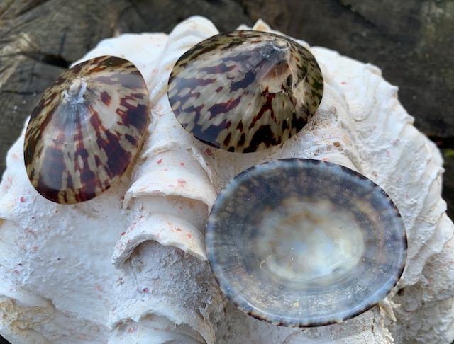 The common turtle limpet – these are polished and we are selling at a great price. Measuring by 6cms by 5 cms approximately. These are not paired but one half of the turtle limpet.