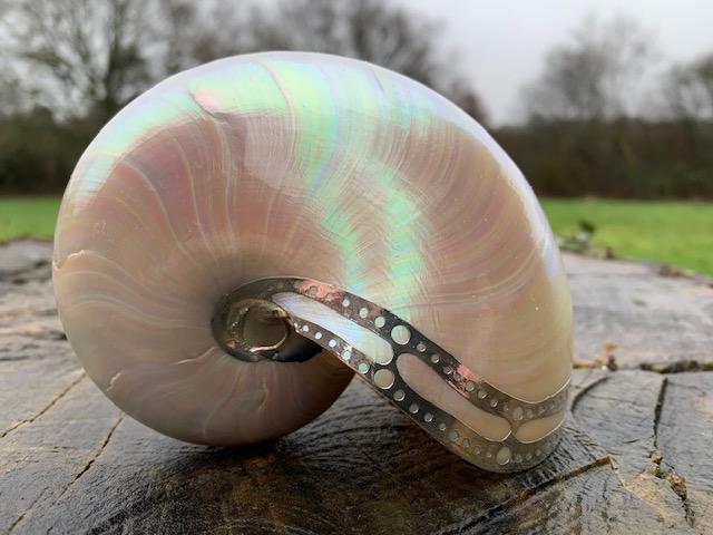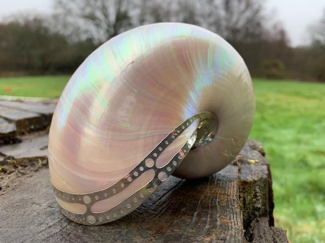 Pearlised beautiful silver edged nautilus – these are measuring 12 cms in length, 9 cms in height and 7 cms in width. The silvering encompasses the outer shell on each side. Limited beautiful seashell