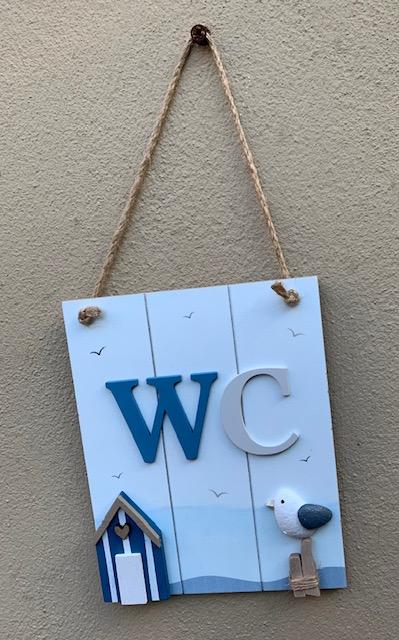 This large wooden WC sign featuring a beach hut and a seagull on a post measures 20 cms by 16 cms plus the length of the rope.